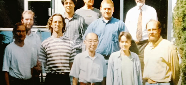 First, in the first plane, Prof. Dr. Ryoichi Kikuchi, one of the brightest minds in materials science of the second half of XXth century, then Prof. Dr. Gerhard Inden himself, standing in front of the door. He influenced most of what we do today in thermodynamics of materials. Below him, at his left, Dr. Martin Palm, one of the key names in the development of intermetallic materials to the present, then in the upper part, at the right of the smiling lady, the then young Dr. Andre Schneider, one of the most prominent names in the use of computational thermodynamics in the industry, until recent times the head of the research centre maintained by Vallourec-Mannesmann, finally, in the lower right part opposite to Dr. Martin Palm, someone who one day had hairs and 30 kg less mass!