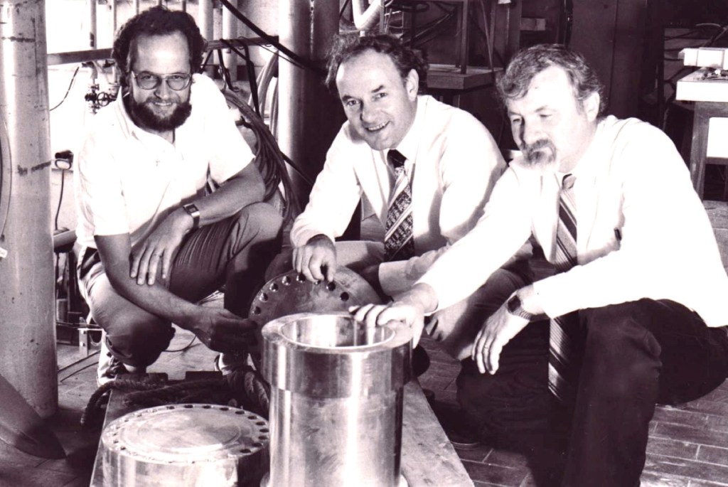 In the picture, some of the most important scientists of contemporary metallurgy, from left to right: Professors Peter J. Uggowitzer, Markus O. Speidel and Heinrich Feichtinger showing a custom-made autoclave which allowed them to alloy steel with nitrogen under high pressures!