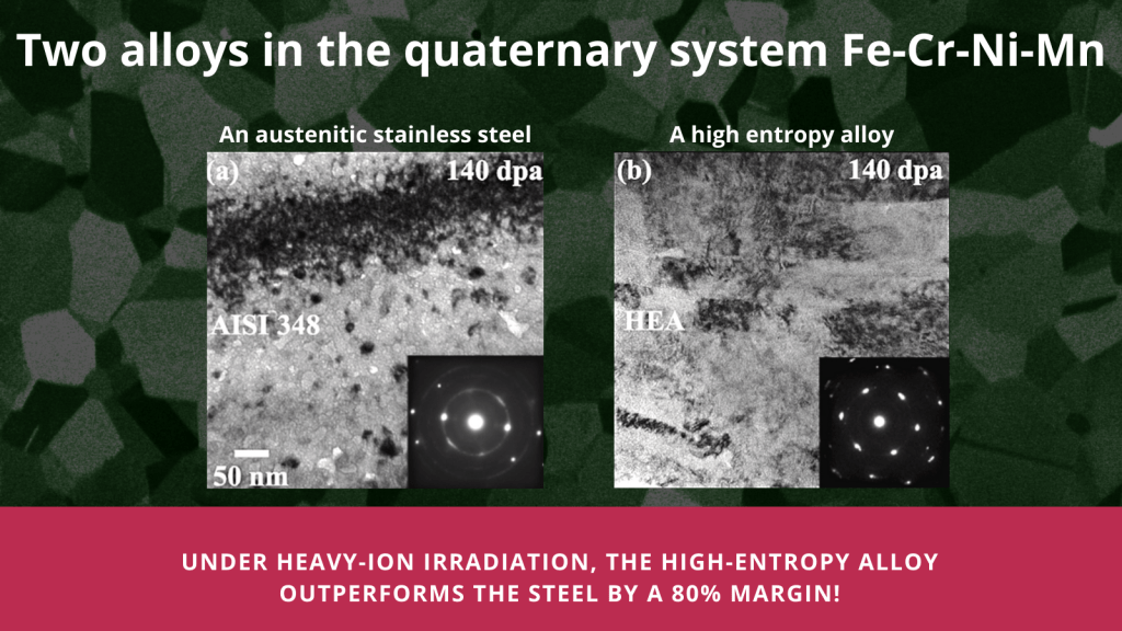 In another great collaboration with Oak Ridge National Laboratory and Universities of Huddersfield, Leoben and São Paulo, we have investigated in depth the radiation response of a FeCrMnNi high-entropy alloy (HEA) compared with a commercial austenitic stainless steel.