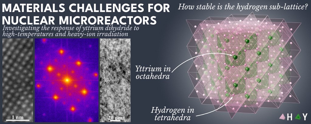 In this new study just published in the prestigious journal Acta Materialia, we present a detailed investigation into the response of yttrium dihydride (YH2) to heavy ion irradiation. Our experiments show that YH2 remains stable up to an irradiation dose of 2 displacements per atom (dpa) and below 800°C, identified as a critical temperature for YH2. We observed nucleation and growth of voids as a function of irradiation temperature, which emerged as the predominant form of radiation damage, distinct from pre-existing defects in pristine YH2 samples. Below the critical temperature, no phase transformation, degassing, or amorphization was detected. Experimental results, integrated with density functional theory calculations, enabled us to propose new strategies for enhancing the performance of metal hydrides in extreme environments, significnatly contributing for the emerging technological leap posed by microreactor technology.