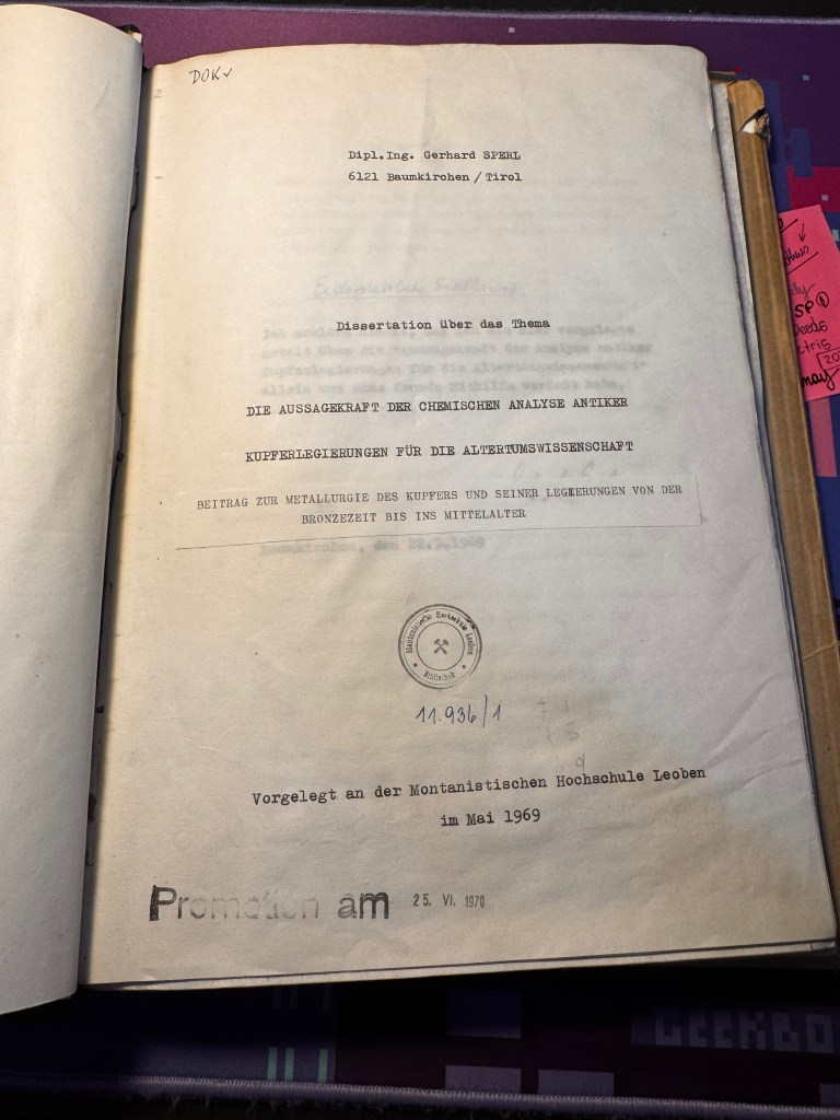 In 1974, he joined the Erich-Schmid-Institut für Materialwissenschaft of the Austrian Academy of Sciences in Leoben, where he would remain until his retirement in 2001. It was here that the two sides of his education finally converged. Working within an institute devoted to the physics and mechanics of materials, Sperl carved out a research programme focused on what metals could tell us about the past: the composition of Bronze Age copper artefacts, the microstructure of ancient iron objects, and above all the chemistry of historical slags. Absolutely extraordinary work documented in the list of references I provide with this text!